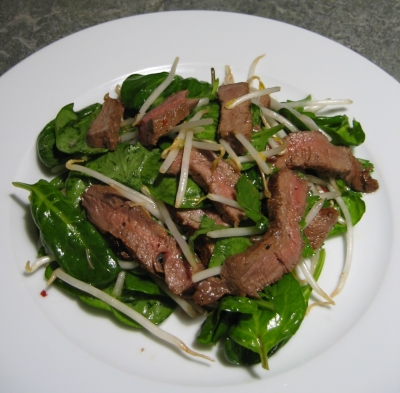 4. Add the beansprouts, shallot or spring onions, spinach and coriander leaves. Thinly slice the beef, add to the salad and gently toss together.