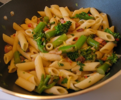 Broccoli, sultana and chilli penneI found this recipe in the August 2007 issue of delicious magazine. Always in search of my creative and healthy ways to eat pasta, I was intrigued by this low-fat and low-salt recipe. Like a few other recipes I’ve seen recently, it uses chilli and lemon to add fat-free flavour. I went for the meaty variation and added some bacon as extra protein (and fat unfortunately). I used multi grain bread instead of ciabatta for the crumbs because I had some that needed using up. I had lots of extra Parmesan crumbs, which kept I kept in a sealed container. When I made this recipe for a second time the next week (for a different crowd of course!), I used up the leftover Parmesan crumbs, but they would also go well on a salad on top of other pasta dishes.